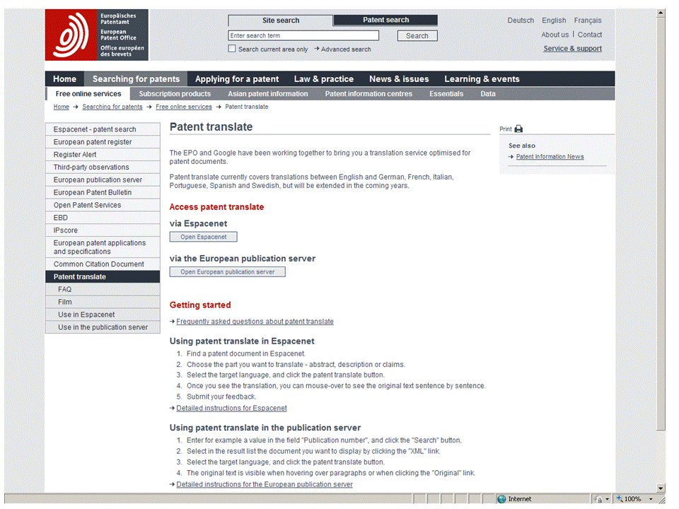 La Oficina Europea de Patentes y Google lanzan un nuevo traductor automático optimizado para traducir patentes: “Patent Translate”. Esta nueva herramienta incluye el español como idioma para poder realizar traducciones de documentos de patentes en ambos sentidos.
