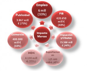 La participación de las marcas en la inversión publicitaria suponen 3.867 millones de euros (más del 75% del total). Además desempeñan un papel fundamental en su impulso de la I+D, con un gasto total en torno a los 4.100 millones de euros (un 55% del total de la I+D española) y en su contribución al Producto Interior Bruto (PIB), con un valor superior a los 400.000 millones de euros (un 40% del PIB español).