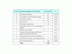Atendiendo a la naturaleza jurídica del solicitante, de las 3.527 solicitudes en 2011, un 16% correspondieron a Sociedades Anónimas, un 17% a Sociedades de responsabilidad limitada y casi un 18% a Organismos Públicos.