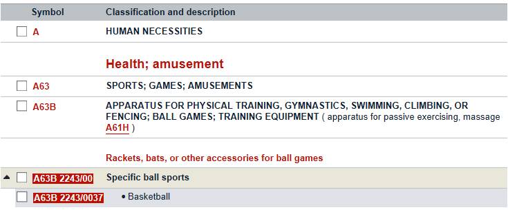 Si introducimos la palabra “baloncesto” en la base de datos de INVENES, obtenemos 529 resultados. Este número aumenta hasta 4.142 resultados si ampliamos la búsqueda a invenciones recogidas en ESPACENET con la palabra clave “basketball”. Comprobamos de esta manera, con una búsqueda muy simple y directa, que la tecnología relacionada con este deporte se encuentra protegida por multitud de patentes. De hecho, tanto la Clasificación Internacional de Patentes (CIP), como la Clasificación Cooperativa de Patentes (CCP, más desarrollada que la anterior), contemplan lugares específicos para el baloncesto, como se puede ver en los siguientes ejemplos.