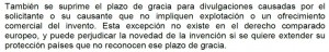También otra excepción la constituye el artículo 7 de la Ley de patentes 11/1986 dedicado a las denominadas “divulgaciones inocuas” o “plazo de gracia”, según el cual no se toma en consideración para determinar el estado de la técnica, una divulgación acaecida en los 6 meses anteriores a la fecha de presentación (no de prioridad) que haya sido consecuencia directa o indirecta: