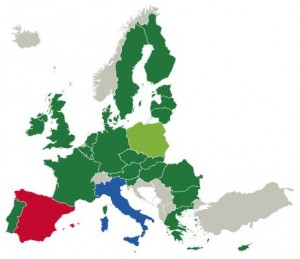 España y Croacia: No forman parte de la cooperación reforzada ni del Tribunal. En el caso de Croacia debido a su reciente incorporación a la UE.