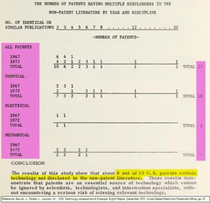 En este informe, en la sección II titulada “The Uniqueness of patents as a technological  resource” aparecen dos estudios donde se analiza el valor de las patentes como fuente de información tecnológica. Para ello a partir de una muestra de 435 patentes americanas correspondientes a dos años de publicación distintos, 1967 y 1972,  se  estudia en que medida la información que aparece en estas patentes está incluida también en la literatura científica, utilizando para ello las  bases de de datos Chemical Abstract (CA), Electrical and Electronics Abstracts (EEA) y Engineering index (EI).