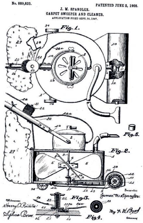 El primer aspirador portátil y susceptible de ser utilizado por una única persona fue inventado por James Murray Spangler, portero de un almacén de Ohio. Padecía de asma y sufría considerablemente cuando tenía que limpiar el local. Para tratar de paliar sus penalidades, se propuso inventar un aspirador portátil. Lo que hizo fue instalar un viejo ventilador dentro de una caja de jabón y utilizar una funda de almohada para recoger el polvo aspirado, luego instaló un filtro confeccionado con ropa y recibió en 1908 la patente US 889823.