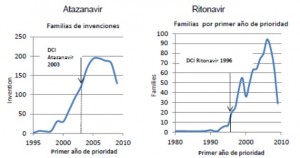 Actualmente no hay ninguna legislación nacional o internacional que obligue a incluir el INN o DCI en los documentos de patente. Sin embargo, en la India se han realizado propuestas encaminadas a ello. Dado el tiempo prolongado que supone la investigación de nuevos medicamentos y la realización de ensayos destinados a la obtención de la correspondiente autorización de comercialización, normalmente la patente ya se ha concedido cuando el nuevo medicamento obtiene la DCI. Sin embargo, en el caso de solicitudes de patentes que se refieren a mejoras de medicamentos ya existentes, habitualmente la DCI ya se conoce en la fecha de presentación de la solicitud. En los siguientes gráficos se observa el número de familias de patentes que sobre el atazanavir y el ritonavir se fueron generando a lo largo del tiempo, indicando el momento en que se obtuvo la DCI.