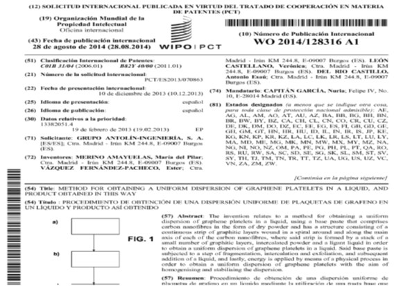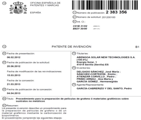 ABENGOA SOLAR NEW TECHNOLOGIES S.A. (ABENGOA RESEARCH) que en colaboración con un grupo de científicos de IMDEA Nanociencia y la Universidad Autónoma de Madrid han desarrollado un nuevo método para crear tintas de grafeno que podría ser usada en una impresora comercial de inyección de tinta, o bien aplicadas en espray sobre superficies diversas. El resultado de estas investigaciones abre la puerta al desarrollo de tintas con funciones tecnológicamente avanzadas.