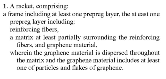 Primera reivindicación de la solicitud US20130090193 sobre utilización del grafeno como refuerzo en el marco de una raqueta