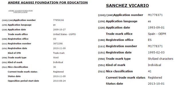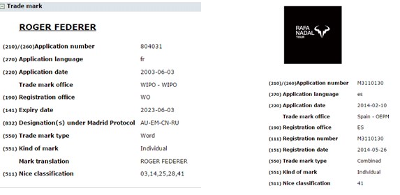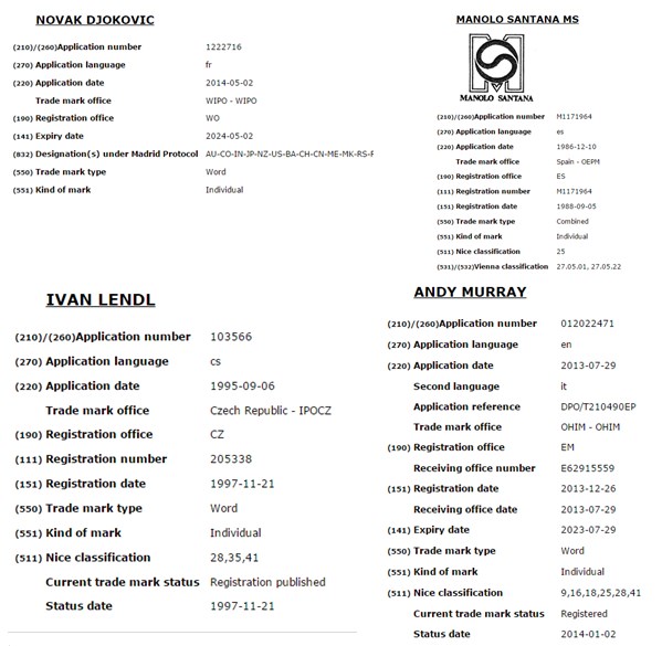 Por supuesto, también en el mundo del tenis hay intangibles que pueden ser protegidos como marcas, sobre todo por lo que se refiere a la imagen de los grandes tenistas. A continuación se ofrece una selección de algunas de estas marcas: