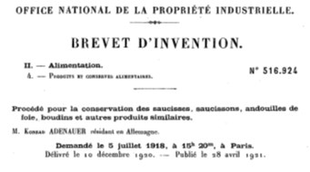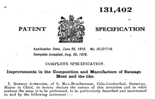 Fue el primer canciller de la República Federal Alemana tras la guerra, desde 1949 a 1963. Fue también el líder de la CDU (Unión Democrática Cristiana), uno de los principales partidos alemanes desde entonces. Lideró a la Alemania Occidental desde la ruinas de la guerra a una época de prosperidad económica. Además de ello, mostró una gran capacidad inventiva y algunas de sus invenciones fueron protegidas mediante patente. Konrad Adenauer fue por ejemplo inventor de las “salchichas de soja”. Adenauer era el alcalde de Colonia durante la primera guerra mundial y debido al bloqueo británico, la ciudad estaba sufriendo escasez de alimentos y hambre. Adenauer comenzó a investigar posibles sustitutos de los alimentos que escaseaban. Uno de ellos era la carne, a la que propuso sustituir con soja. A estas salchichas se les llamaba “Friedenswurst” o “salchichas de la paz”. Se dice que presentó una solicitud de patente ante la Oficina de Patentes Alemana pero que la patente no fue concedida porque iba en contra de las regulaciones alemanas en relación al contenido de las salchichas. Paradójicamente, la patente fue concedida por el enemigo, por Gran Bretaña, en 1918 con el número GB131402A.