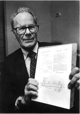 Gordon Gould fotografiado en 1987 mostrando su patente por el amplificador óptico. Fuente: http://www.photonics.com