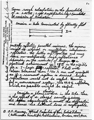 Según la versión de Gould tanto la idea del desarrollo del láser como el acrónimo fueron suyos y dándose cuenta de la importancia de lo que tenía entre manos, corrió a registrar ante notario su cuaderno de notas. Sea como fuere, los historiadores aún no se han puesto de acuerdo, el cuaderno de Gould recoge las ideas básicas del invento, y lo que parece fue aún más importante, el término LASER, que fue la base sobre la que finalmente muchos años más tarde en 1987, Gould ganó la guerra de patentes de los 30 años.