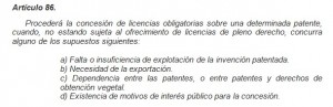 En España, las licencias obligatorias se encuentran reguladas en el capítulo II del título IX de la Ley de Patentes 11/1986 . En concreto, el Art.86 de dicha Ley establece que: