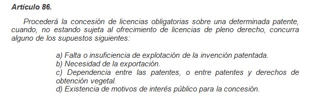 El proyecto de Ley de patentes que se está debatiendo en el congreso incluye en su artículo 91 un supuesto adicional para la concesión de licencias obligatorias:
