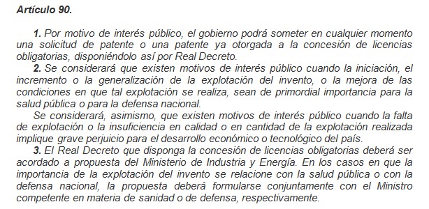 Un tipo de licencias obligatorias especialmente relevante, por lo excepcional de las mismas, lo constituyen aquellas que podrá conceder el gobierno por motivos de interés público y que se encuentran reguladas en el artículo 90: