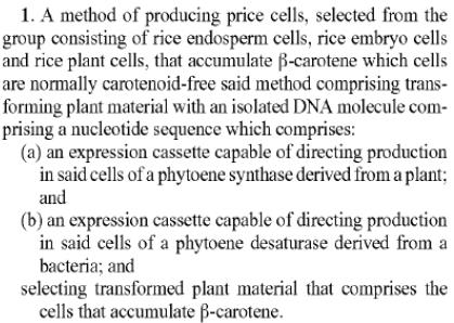Golden rice. La patente US7838749B, cuyo titular es la compañía “Syngenta Biotechnology” y tiene como inventores a Ingo Proykus y Peter Veyer, protege un procedimiento que tiene como objetivo modificar genéticamente el arroz para aumentar su contenido en vitamina A, cuya deficiencia es un grave problema nutricional infantil, especialmente en ciertas zonas de Asia. Gracias a licencias muy ventajosas concedidas sobre la patente, instituciones públicas de China, India, Bangladesh, Indonesia, Filipinas y Vietnam están explotando esta variedad de arroz , a la que se denomina “golden rice”, al mismo coste que el arroz tradicional.