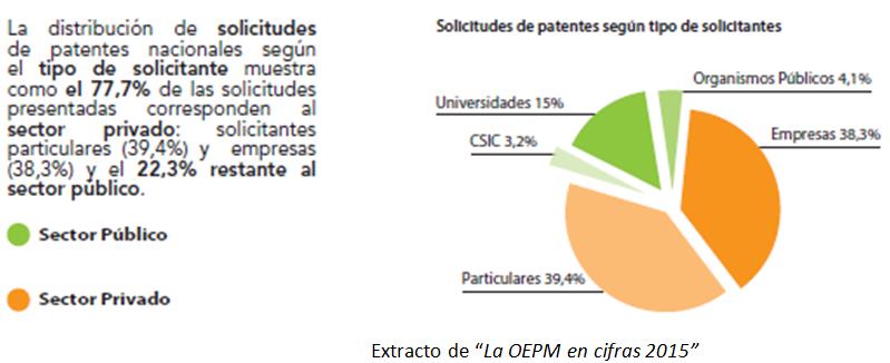 En esta ocasión nos vamos a centrar en un aspecto de particular relevancia para un sector muy grande de la población española y fundamental de la I+D+i española: nos referimos al Personal Investigador de las Universidades Públicas (más de 100.000 personas – curso 2014/2015 (1)) y de los Entes Públicos de Investigación (más de 300.000 personas – año 2013 (2)). Estas más de 400.000 personas presentan al año en España más del 22% de las solicitudes de patentes (3).