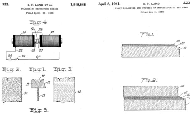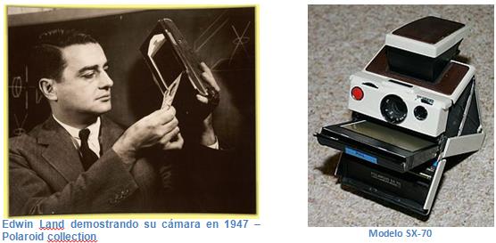 La cámara instantánea es la invención más relevante del inventor estadounidense Edwin Land (1909-1991). Nacido en Connecticut, comenzó a estudiar química en la Universidad de Harvard, pero abandonó la carrera tras el primer año. Su primera invención fue la de una lámina de plástico polarizadora; el primer filtro polarizador de luz de coste de fabricación lo suficientemente barato como para emplearse de forma generalizada en las gafas de sol. Esta primera invención dio el nombre a la compañía “Polaroid” fundada por Land y Wheelwright, su profesor de física en la universidad. La invención se protegió mediante las patentes US1918848 y US2237567. Desde el principio, Land fue muy astuto en la comercialización de sus productos; por ejemplo, para vender a la compañía “American Optical Company” su lámina polarizadora, invitó a unos ejecutivos a su hotel a última hora de la tarde, cuando la ventana de su habitación reflejaba los últimos rayos del sol sobre una pecera, haciendo prácticamente imposible ver el pez en su interior. Land entregó entonces a los ejecutivos una muestra de la lámina polarizadora y gracias a ella fueron capaces de ver el pez perfectamente. Land les dijo que a partir de entonces sus gafas de sol estarían fabricadas en ese material y la compañía firmó un acuerdo con él.