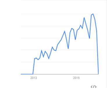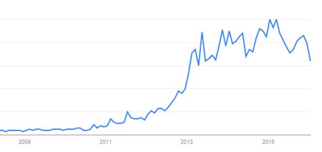 Aunque las patentes “esenciales” están caducando y los precios de las impresoras están disminuyendo, hay que tener en cuenta que los materiales que se emplean son bastante caros, sobre todo por los aditivos de titanio y que es preciso poseer conocimientos de CAD y software avanzado. De cualquier modo, resulta innegable que el sector lleva viviendo una revolución desde hace unos pocos años. La siguiente gráfica de “google trends” muestra cómo ha crecido el número de búsquedas en google, en relación con “impresión 3D” en los últimos dos años: