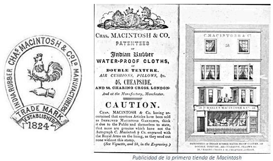 La paternidad de la invención de las primeras telas impermeables se le reconoce al químico escocés Charles Macintosh. Solía experimentar con el alquitrán y la nafta y la esencia de su invención de un tejido impermeable consiste en la unión de dos capas de tela mediante una solución de caucho natural en nafta. El caucho natural se convertía en soluble mediante la acción de la nafta. Parece que la costumbre de forrar los tejidos con látex para convertirlos en impermeables era ya conocida por varios grupos indígenas de Sudamérica, pero el látex era demasiado inestable para transportarlo a Europa. También en España se habían fabricado contenedores con una estructura similar para alojar mercurio.