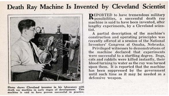 En un artículo publicado en la revista “Modern Mechanix” en septiembre de 1934 se afirmaba que la invención había sido declarada secreta por el Gobierno de los EE.UU. para su uso como arma defensiva en caso de necesidad.