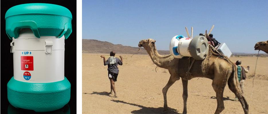 El contenedor aislante Arktek y su uso para transportar vacunas a través del desierto en Etiopía. Fuente: Gates Foundation