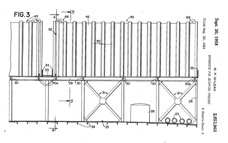 Entonces, se le ocurrió que, en lugar de cargar el chasis de los camiones, se trasladaría únicamente el contenedor propiamente dicho, la caja. Patentó una disposición de dichas cajas sobre la cubierta de un barco de transporte a granel de líquidos, vendió su compañía de transporte por camión y compró dos compañías de transporte marítimo para poner en práctica su proyecto. La patente en cuestión es la estadounidense de número US2853968 y según se puede observar en las figuras, se refiere a una fijación de los contenedores o cajas sobre la cubierta de un buque.