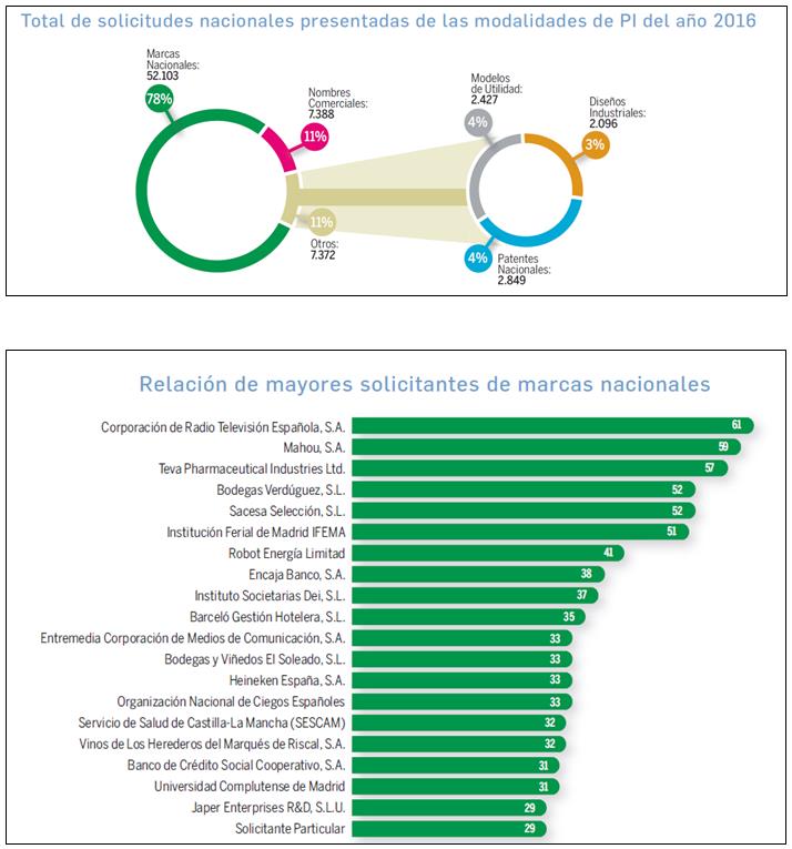 Si revisamos las estadísticas publicadas en la OEPM  (OEPM en cifras 2016), el año pasado se registraron más de 50.000 marcas, siendo los mayores solicitantes las organizaciones Corporación de Radio y Televisión Española, Mahou y Teva Pharmaceutical Industries, seguidas muy de cerca por Bodegas Verdúguez, Sacesa Selección e Institución Ferial de Madrid ( IFEMA).