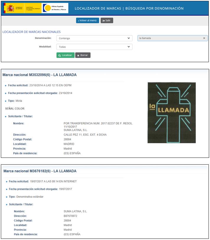 Si accedemos al localizador de marcas españolas e introducimos la denominación “La llamada”, nos aparecen 13 referencias entre las que se encuentra varias marcas relacionadas: la marca M3676182 y M3532096