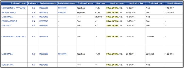 Si realizamos una consulta con el nombre del solicitante “SUMA LATINA” detectamos que esta empresa tiene otras denominaciones en cartera: “Paquita Salas”,  “Los Javis”, “Campamento la Brújula” e incluso el nombre “Suma Latina”.