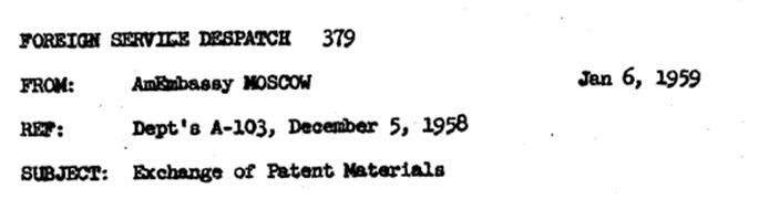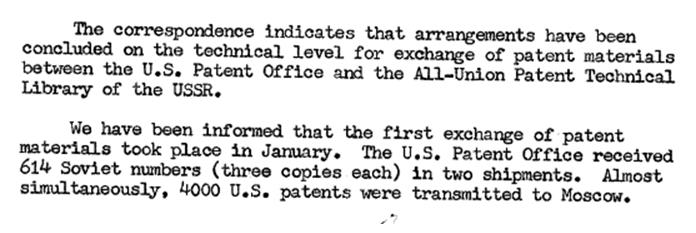 Este documento, fechado en 1959, muestra cómo la muerte de Stalin había provocado cierto deshielo en las relaciones USA-URSS, lo cual permitió que se firmara un acuerdo para el intercambio de patentes entre la USPTO (Oficina Norteamericana de Patentes) y la Biblioteca de patentes de la URSS. El objeto del intercambio era por un lado las “gacetas oficiales” y por otro tres certificados de inventor soviéticos y un grupo de patentes norteamericanas. En aquellos años la “publicación de las patentes” no garantizaba un fácil acceso a los documentos. En este otro documento se menciona un intercambio más ambicioso; 614 patentes soviéticas frente a 4.000 estadounidenses.