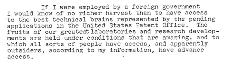 En esta carta de 1956, un coronel retirado, probablemente agente de patentes de la compañía “Toulmin & Toulmin” (famosa por haber tramitado las patentes de los hermanos Wright) denunciaba a la CIA, ante la falta de atención prestada por los dirigentes de la USPTO y del Departamento de comercio, que existía peligro de filtración del contenido de las solicitudes de patentes en tramitación. Se refiere a una carta de Hoover, director del FBI, que le había contestado que no había base legal para actuar.