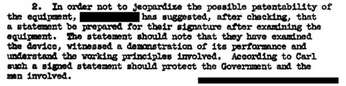 Parece que los miembros de la CIA eran muy conscientes de los requisitos que una invención debía cumplir para poder ser patentada; en este memorándum se organiza en 1962 la inspección de una invención relativa a un lector de código binario y el redactor apunta la necesidad de que se firme una especie de “contrato de confidencialidad” que evite que la divulgación afecte la posterior patentabilidad de la invención.