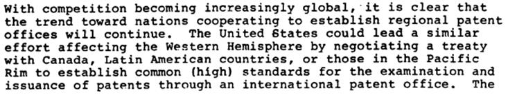 En esta documentación de 1985, que incluye los documentos de trabajo de un grupo de propiedad intelectual, se observa que se estudió la posibilidad de crear una Oficina de Patentes para todo el continente americano, inspirada en el modelo de la Oficina de Patentes Europea.