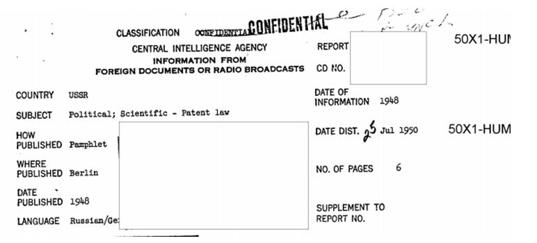 Otra muestra de lo difícil que era acceder a las patentes publicadas en los países del este durante la guerra fría es este comunicado donde se informaba que se encontraban a disposición de aquellos interesados en la biblioteca de la CIA, 15 patentes sobre invenciones electrónicas concedidas en Alemania del Este en 1952. La Oficina de Patentes de Berlín Este estaba bajo vigilancia, porque en este informe de 1950 se comunicaba que, aunque el director de dicha Oficina parecía haber abandonado su puesto y residía en Berlín Oeste, se sospechaba que aún trabajaba para la Oficina de Patentes en la zona rusa.