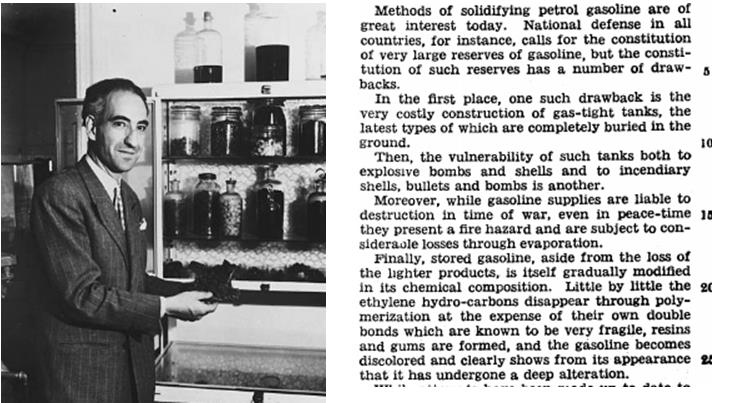 Jean Pathus-Labour (inventor en una patente sobre la gasolina solidificada) y fragmento de la descripción de la patente US2578432, donde se pone de relieve el interés militar de una “gasolina solidificada”.