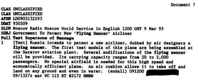 La desaparición de la Unión Soviética no hizo que disminuyera el interés por lo que Moscú podría patentar. En esta nota se recoge que Radio Moscú había anunciado que el gobierno ruso pretendía patentar una nave en forma de “platillo volante”, con capacidad de hasta 2000 pasajeros y que podría despegar y aterrizar en cualquier superficie, incluyendo el agua.