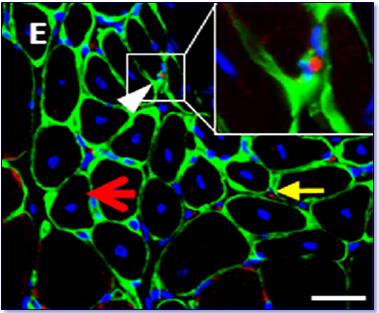 Imagen de células madre musculares (color rojo). Fotografía obtenida de Hellinska et al. Hellinska et al. European Journal of Cell Biology. Enero2017, Vol. 96, Nº 1, páginas 47-60.