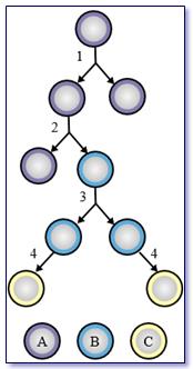 Esquema de división y diferenciación de las células madre. Al dividirse, las células madre (A) son capaces de producir células idénticas a ellas y otras que comienzan el proceso de diferenciación (B) y que producirán células totalmente diferenciadas tras sucesivas divisiones. Fuente de la imagen: Wikipedia