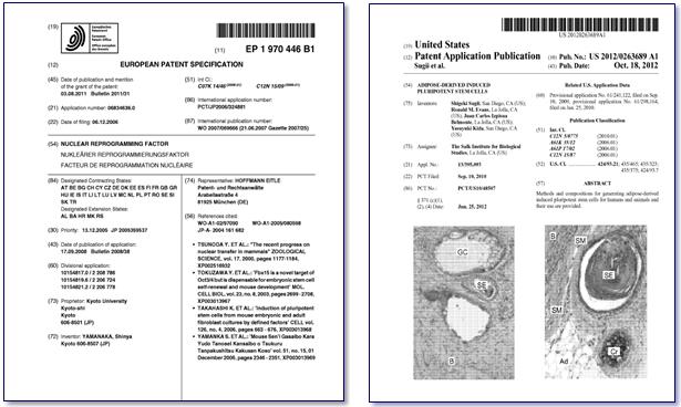 Imagen izquierda: EP1971446. Patente de Yamanaka en la que se describe la obtención de iPSCs mediante la expresión de los genes Oct4, Sox2, Klf4 y c-Myc en células de ratón adultas.