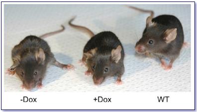 Fotografía de tres ratones utilizados en el experimento. –Dox: ratón transgénico con progeria al que no se ha sometido a ningún tratamiento. +Dox: ratón transgénico con progeria en el que se ha inducido la expresión de los factores de Yamanaka. WT: ratón sano. El ratón con progeria sometido a tratamiento, presenta mucho mejor aspecto que al que no se le indujo la expresión de los factores de Yamanaka. Imagen obtenida de Ocampo, A. et al. Cell. 15 diciembre 2016, Vol. 167, Nº 7, páginas 1719-1733.