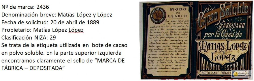 Se trata de una marca denominativa: “Matías López” que se solicitó en el mismo año de inauguración de la fábrica situada en el Escorial.