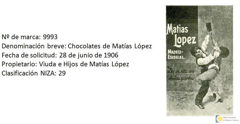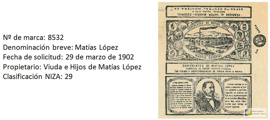 Y hablando de chocolates no podemos olvidar la fábrica chocolatera “Chocolates y Dulces Matías López”, fundada en el Escorial en el año 1875 por el empresario Matías López y López, gran defensor de la Propiedad Industrial, como comentábamos en la noticia publicada por la OEPM con motivo de una exposición fotográfica en el Escorial.