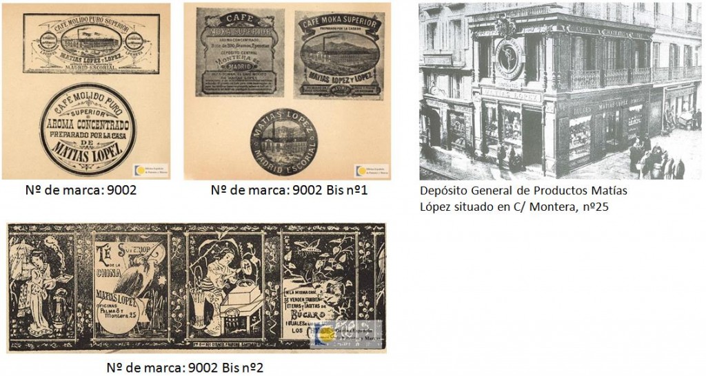 Encontramos algunas marcas de café e infusiones elaboradas por la casa Matías López. Como vemos la tienda principal (deposito central) se encontraba en Madrid, en la calle Montera nº25.