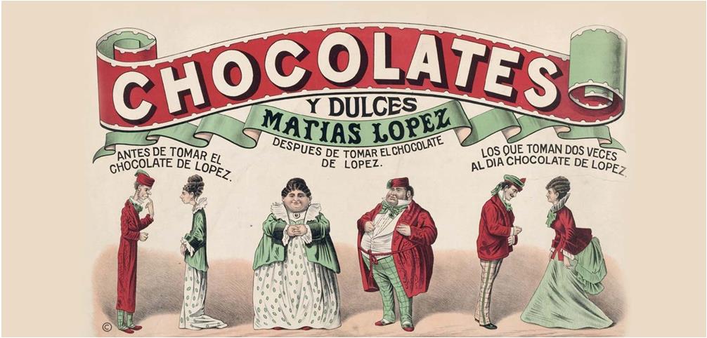 “AVISO IMPORTANTE: Algunas fábricas de Chocolate han adoptado en sus cubiertas los mismos colores de papeles que hace tanto tiempo venía usando la casa de Matías López, y para evitar equivocaciones, el Sr. López previene al público, que desde hoy llevarán las cubiertas de sus Chocolates su retrato, y recomienda vean si la cubierta dice: CHOCOLATES MATÍAS LÓPEZ.”