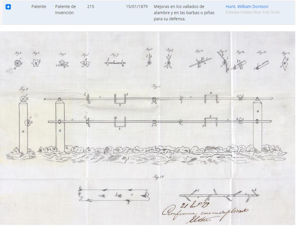 En España, la primera patente sobre un alambre de espino que se ha encontrado en la base de datos del archivo histórico es la de número ES215, presentada en 1879 por el ciudadano de New York William Donison Hunt.