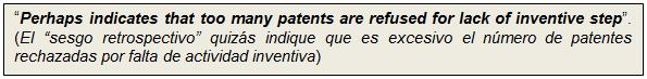 Se observa que el “sesgo retrospectivo” multiplica el que la “evaluación de la actividad inventiva” arroje resultados negativos. La advertencia sobre sus “peligros” no tiene demasiado efecto.
