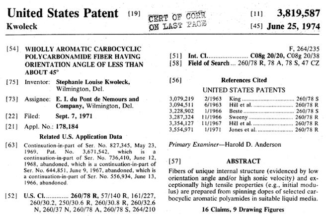 Entre 1966 y 1974 fueron registradas en EE.UU. hasta trece patentes en relación a las poliamidas, siendo la US 3 819 587 la referida al Kevlar ® propiamente dicho, a su vez protegido comercialmente con una marca (la estadounidense 983.080 de 1974). Entre sus más de 200 aplicaciones se encuentran equipos de protección (cascos, chalecos antibalas, blindajes), refuerzo de neumáticos, cables, material deportivo (tenis, hockey, piragüismo), altavoces, instrumentos musicales, telefonía móvil, ropa, objetos ignífugos y piezas automovilísticas y aeroespaciales.