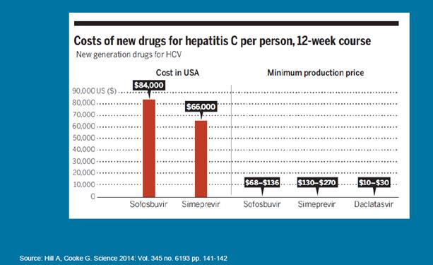 Otra herramienta que proporciona la OMS para la selección de medicamentos es la lista de medicamentos esenciales, que se actualiza cada dos años, la última vez en junio de 2017, y que contiene 433 medicamentos. Desde el punto de vista de la hepatitis C, se han incluido los nuevos medicamentos, que suponen una gran novedad, pues permiten la curación de la enfermedad y sin efectos secundarios reseñables. Este es uno de los grandes casos de éxito de la industria farmacéutica innovadora en los últimos años. Sin embargo, el lado negativo es el elevado precio en ciertos mercados, especialmente, cuando se compara con el coste de producción, como muestra la siguiente gráfica: