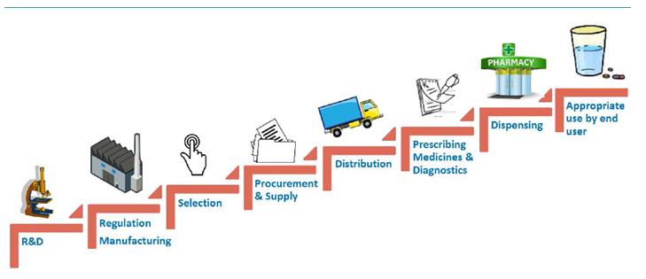 En primer lugar, la investigación y el desarrollo, luego cómo se fabrican, con una buena calidad, a continuación, hay que seleccionar los medicamentos que realmente interesan, en los que hay que invertir, la compra y el suministro, donde hay que evitar la corrupción, una distribución que permita su prescripción.