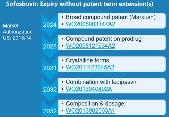 La siguiente gráfica muestra como la fecha de caducidad de la patente sobre un determinado medicamento (en este caso el sofosbuvir) se va a extendiendo: partiendo de una patente sobre una fórmula Markush, siguiendo con compuestos de partida, formas cristalinas y combinaciones y terminando con dosificación, formando lo que se denomina una maraña de patentes.